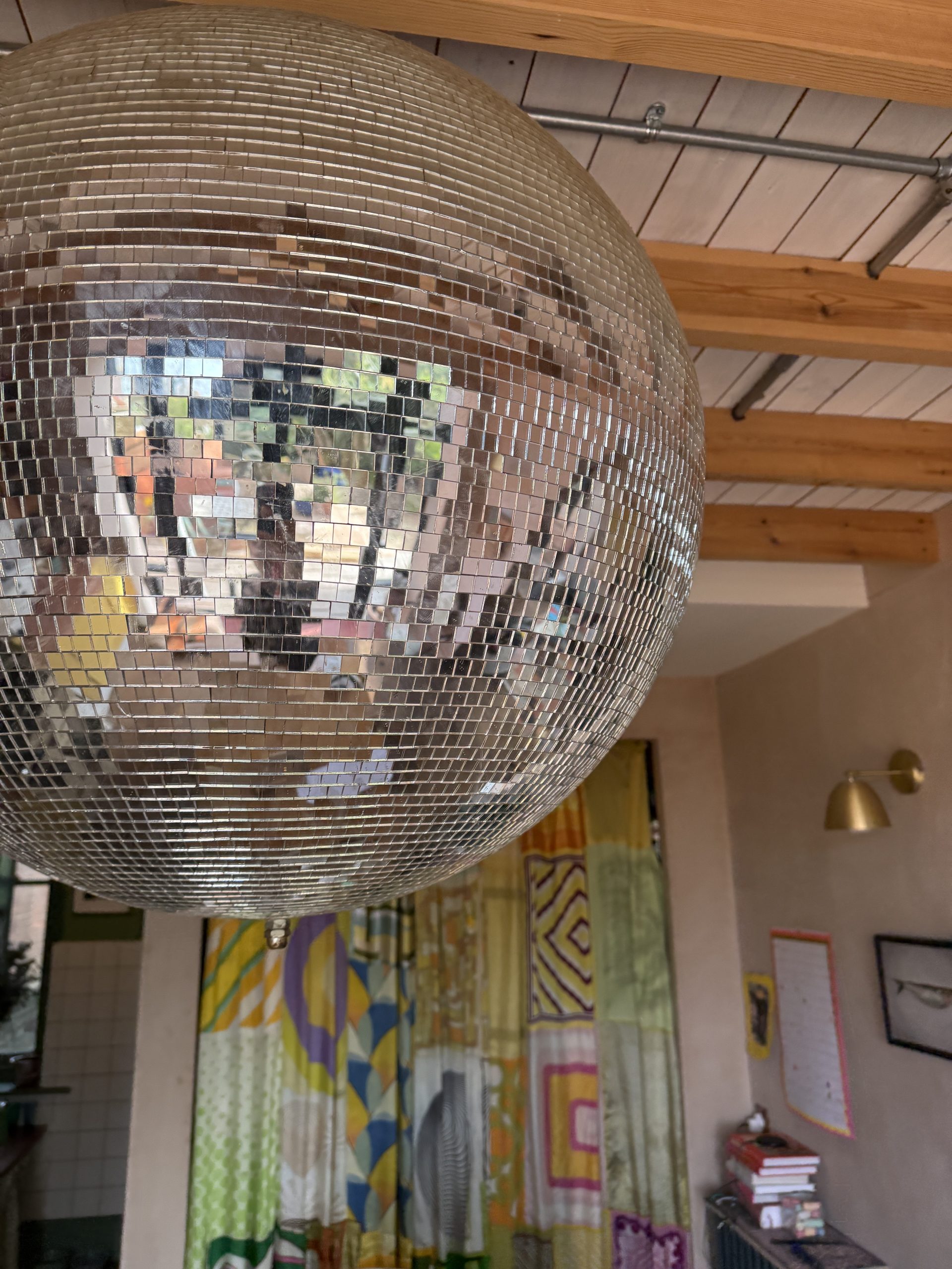 Our giant disco ball is my best second-hand fine ever. We bought it from a wedding venue that was closing down in Brixton when we lived there. Unfortunately it was too big to fit through the door of our Brixton flat, so we had to keep it at work until we moved to Brighton and got a doorway big enough to fit it in. It is now the centrepiece of our kitchen discos.
