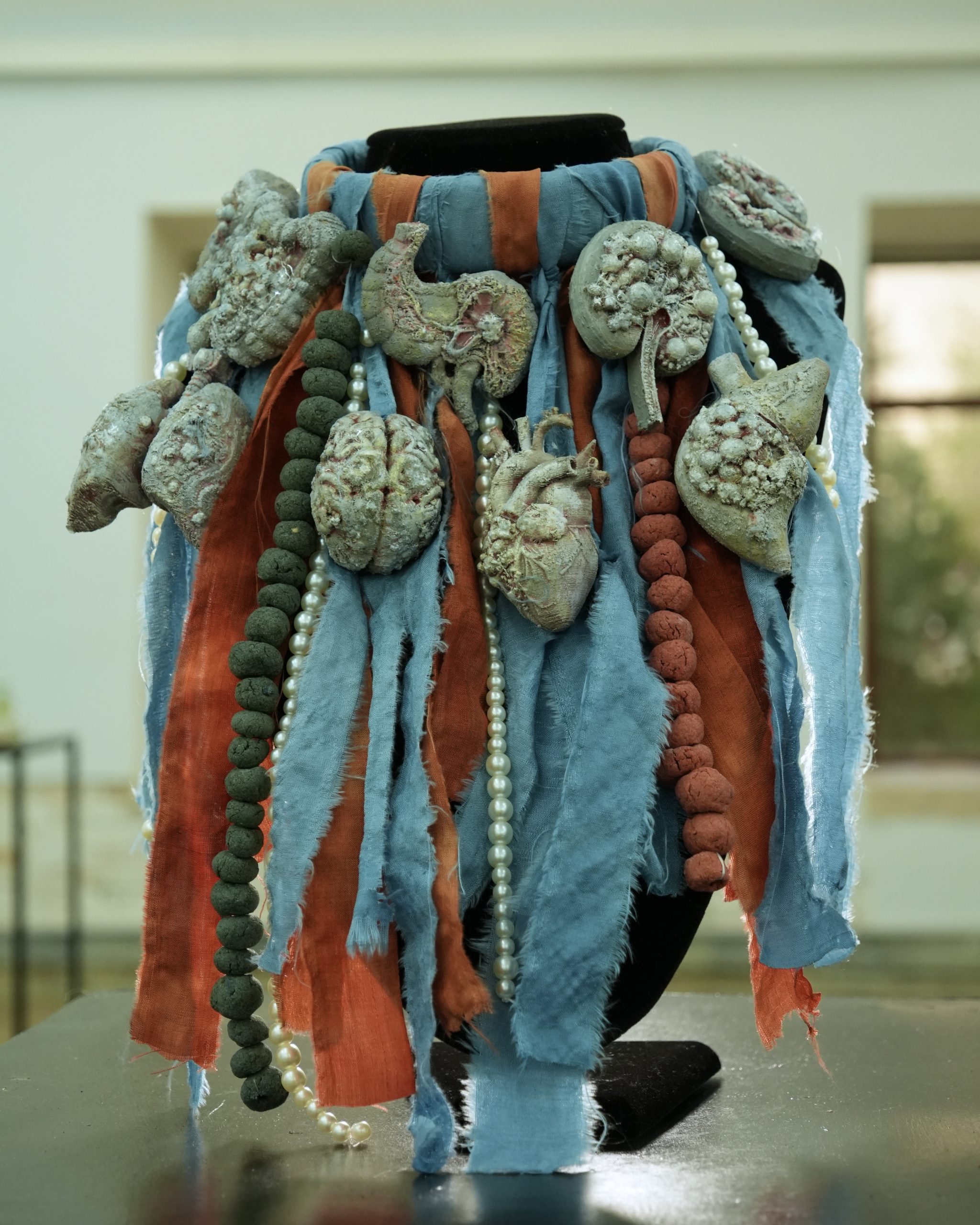 Yes, I am making second versions of two works for the show in Brighton. The “Materia Medical Necklace” which is inspired by Avicenna’s writings in his “Materia Medica” (book 2) where he describes treating a range of illnesses using madder root, pearls and roasted silk, and the “Healing Bowl” which is made from my own biomaterial recipe with compost from bio-digested hospital aprons from Europe, and indigo which has been researched in Uzbekistan as a means of reducing the salinity of the soil there, and has shown benefits.