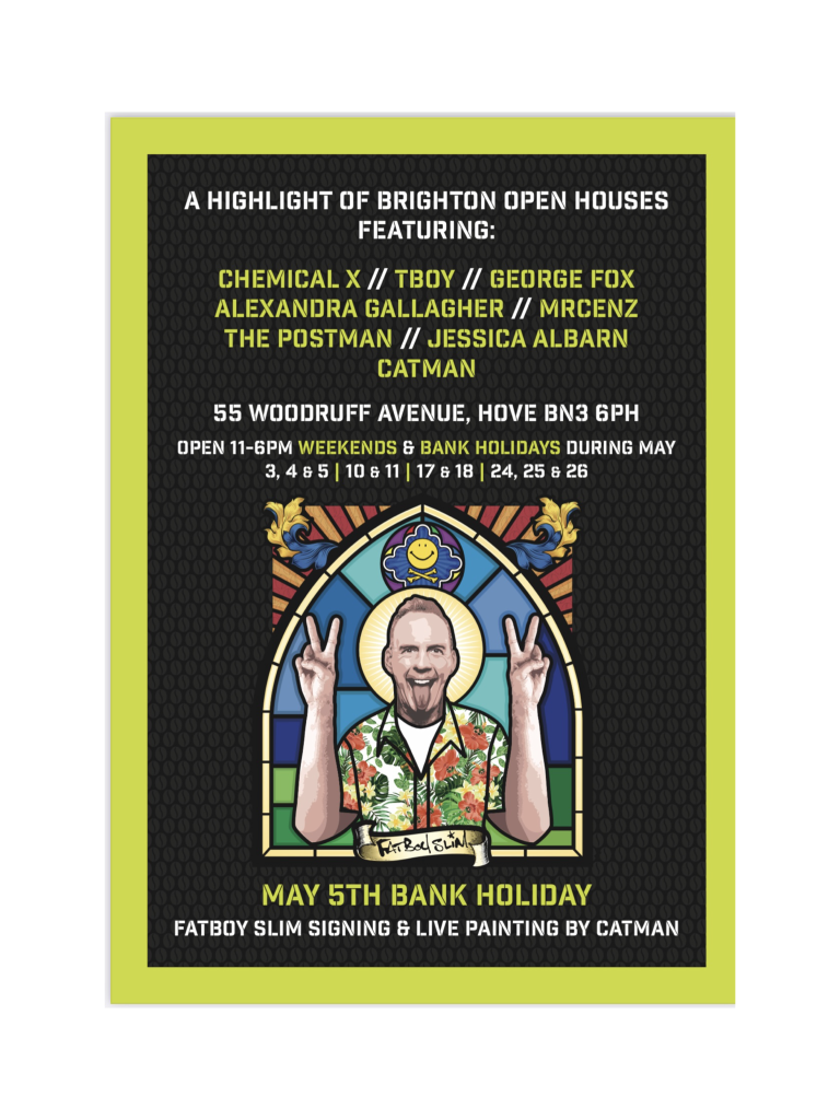 Fatboy Slim, as one of the three Directors of Pepita Coffee, will be at the house, in person, on BH May 5th, signing purchases at a meet and greet with local, established artist, TBOY, whilst another celebrated artist, Catman, does a live painting in the garden.