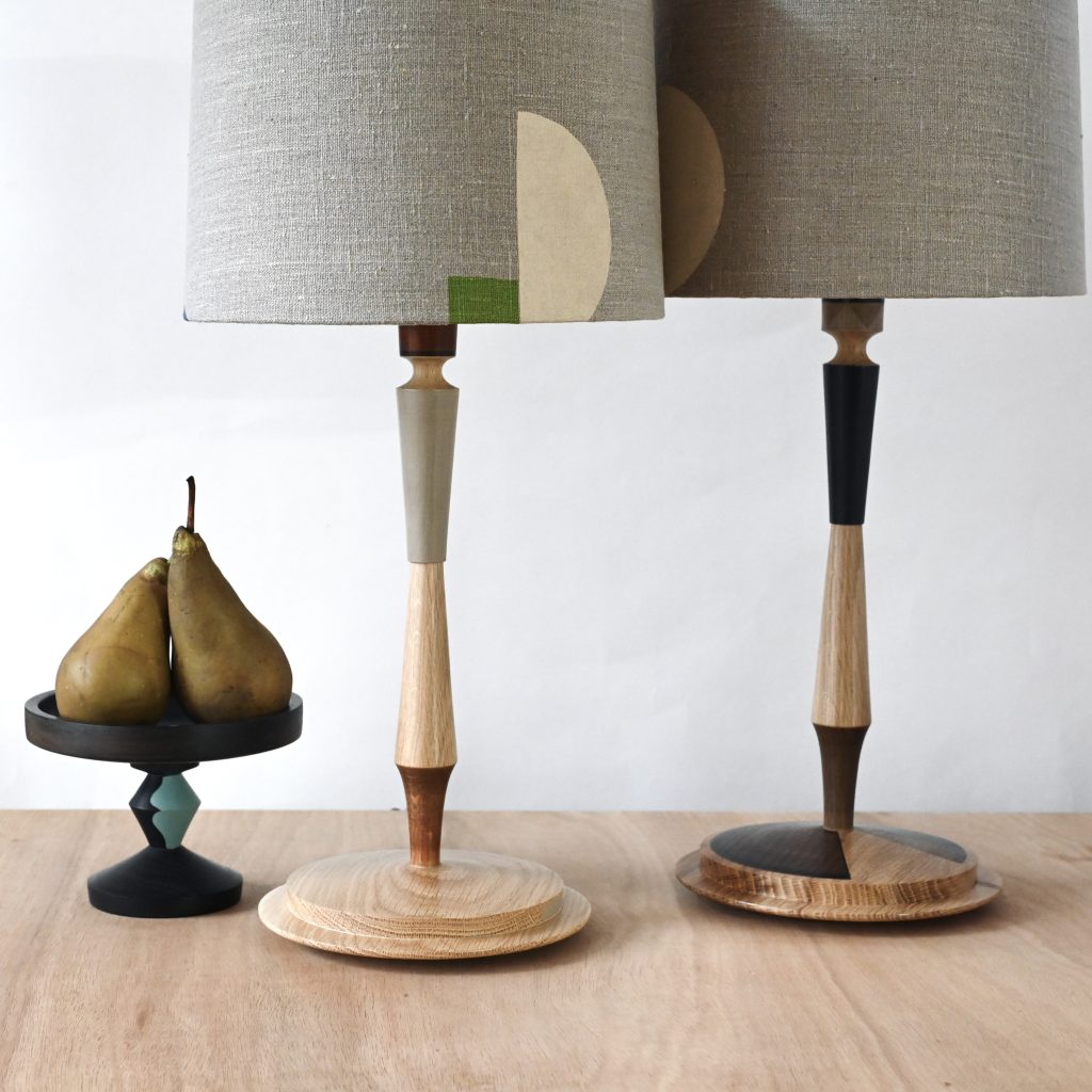 Oak lamps with hand printed linen shades and pedestal oak bowl with pears