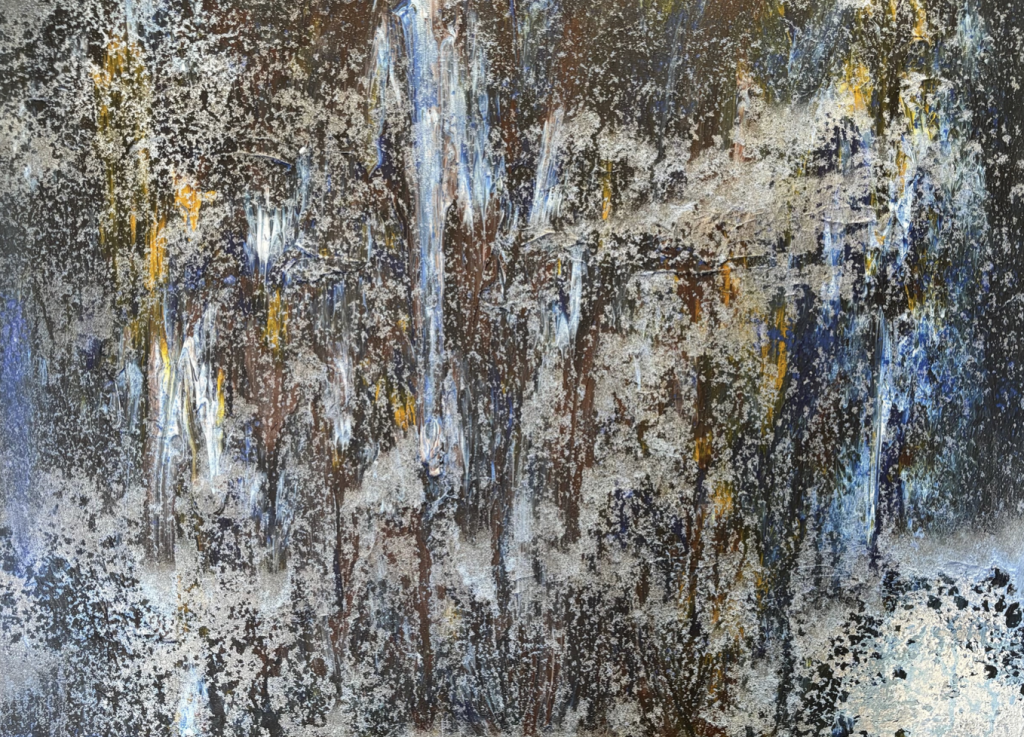 Bermudez‑Castillo works without preparatory sketches, guided instead by intuition and emotional resonance. Brushes and palette knives leave decisive, physical traces on the surface, creating a dynamic interplay between gesture and material.