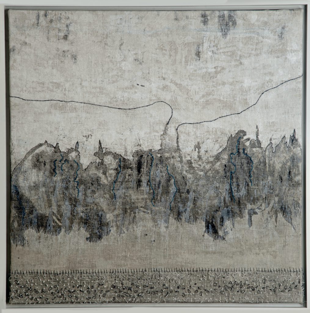 Susie’s tactile paintings draw inspiration from the muted palettes of northern coastal landscapes, their geology, shifting light, the blurred horizontal lines as the sea merges with the vastness of the sky. Her practice combines stitch, painting, and printmaking, layering colour and texture to create the narrative of place. Working with earth pigments bound in a biodegradable soya-milk medium she developed, her materials are rooted in the landscape itself.Stitches map marks found on the land, the mediative hand stitching becomes a metaphor for the repetitive rhythms of nature that forms texture and undulations like you find on the earth’s surface, the constant rise and fall of the global ocean tide. Solitary walking is central to her practice: experiencing the elements, gathering and recording observations. Her field trip sketchbooks are an invaluable resource, informing her studio work.