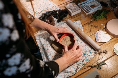 Sarah will be demonstrating how she makes her pieces of pottery using botanicals to create the nature inspired marks in her work. She presses seasonal flowers and foliage, such as cow parsley or ferns directly into rolled or moulded real clay to make her creations, such as trinket bowls, dishes, plaques. She hand paints them and then fires them in her kiln, to create beautiful individual items, for the home.