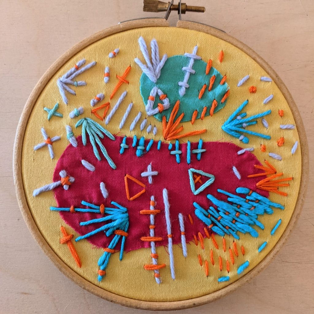 Through simple guided prompts, we’ll explore freeform hand stitching, working intuitively with colour, texture, and fabric. There’s no fixed outcome; instead, you’ll be encouraged to follow your instincts, responding to the materials in front of you and letting your piece evolve naturally.
