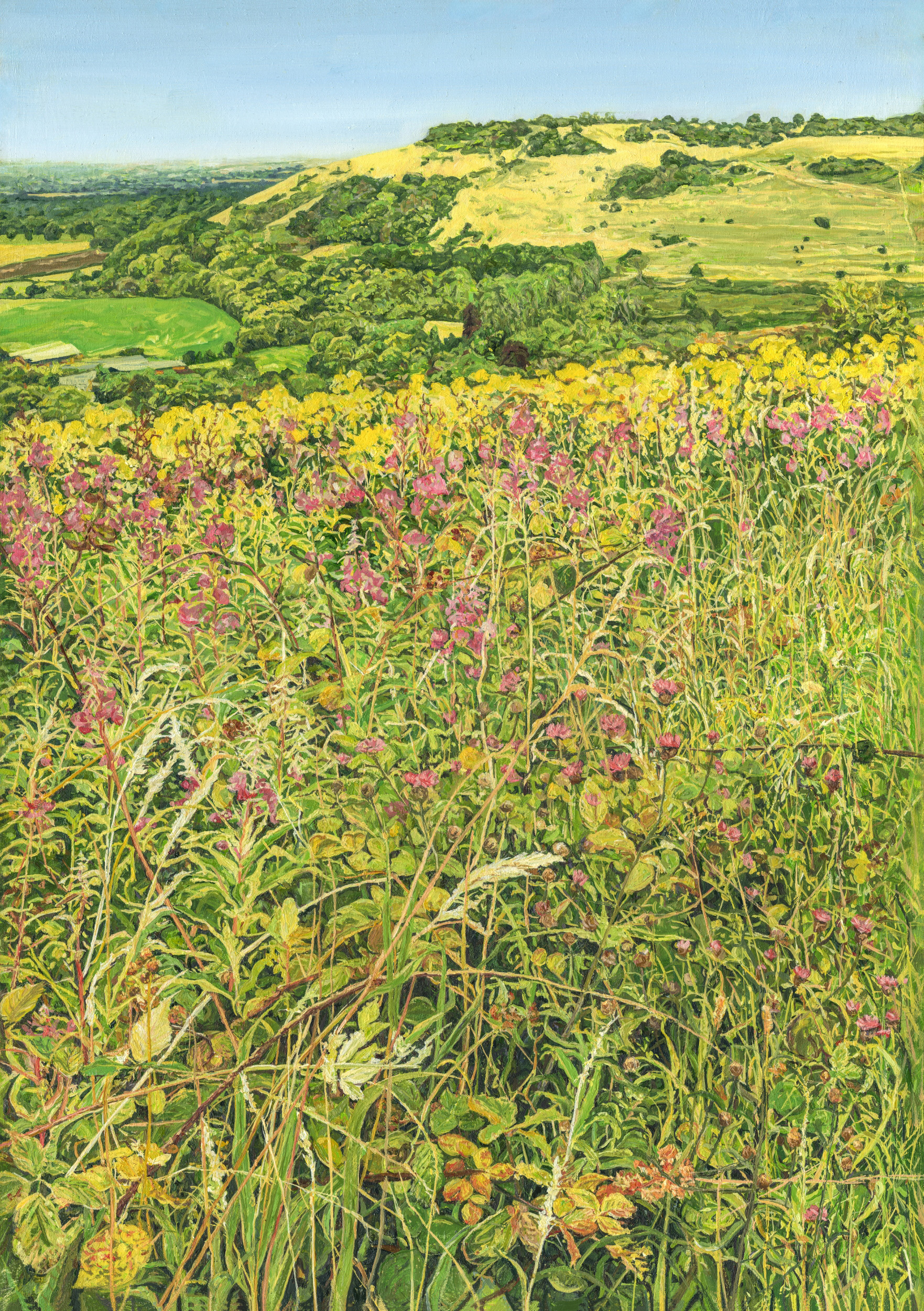 A joyful picture of pink rosebay willowherbs, bright yellow ragwort, and brambles, are in the fore of this painting which has Newtimber Hill, in the background.