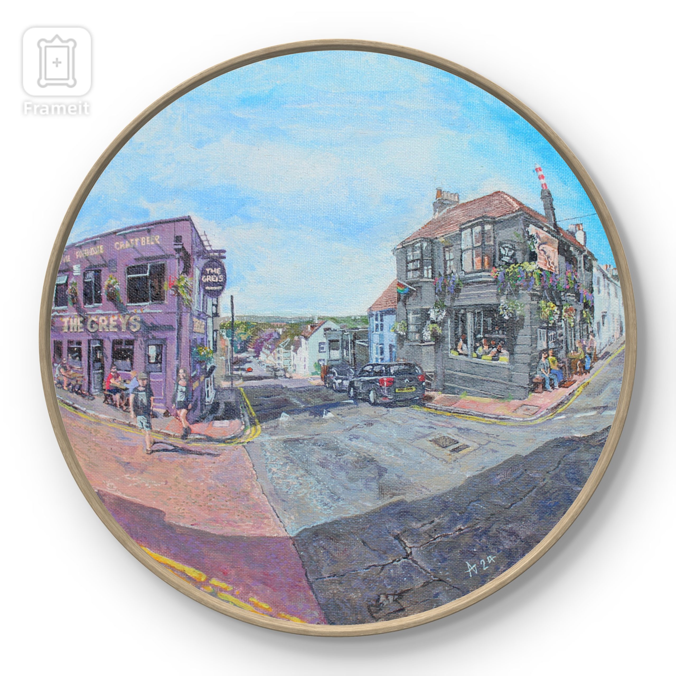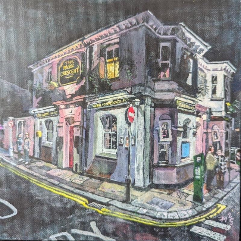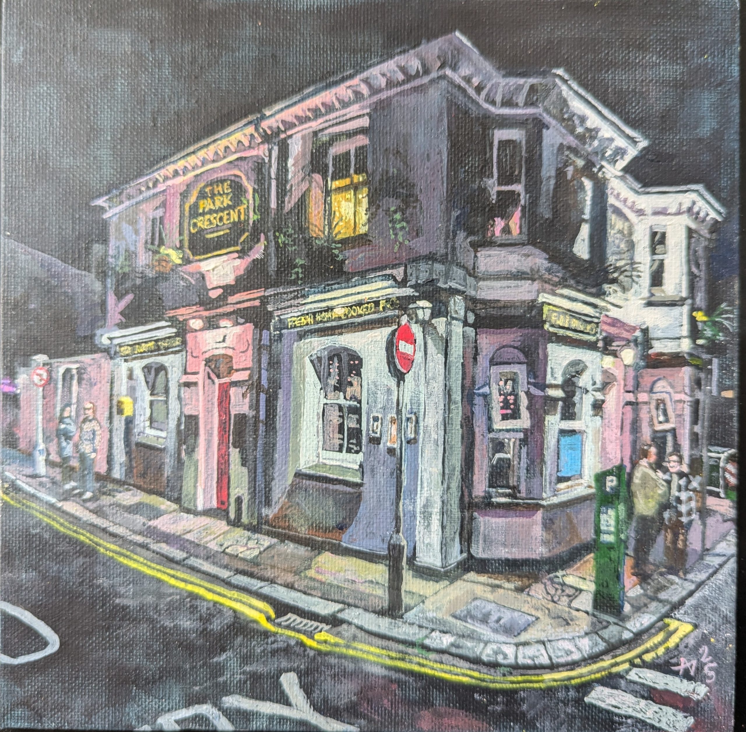 Landscape acrylic painting of the end of terrace, derelict, green tiled Montréal Arms pub. Foreground has a seagull dragging a discard, silver takeaway container spilling brown curry on the road. The sky is blue and clear with the pub bathed in sunlight.