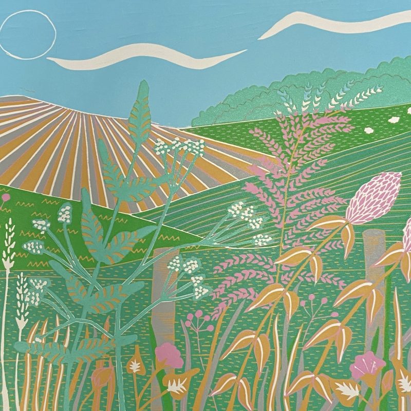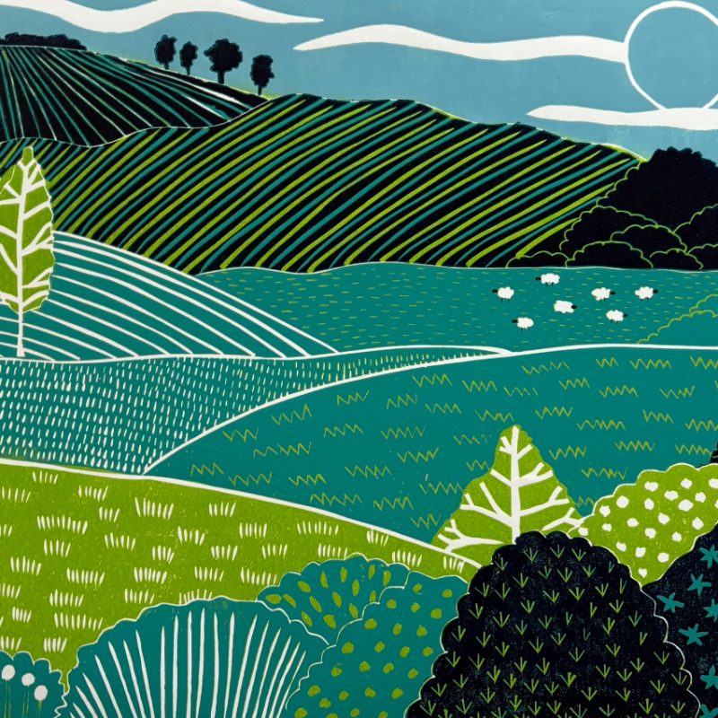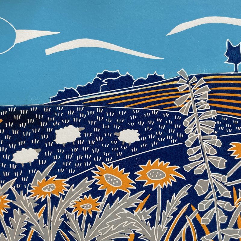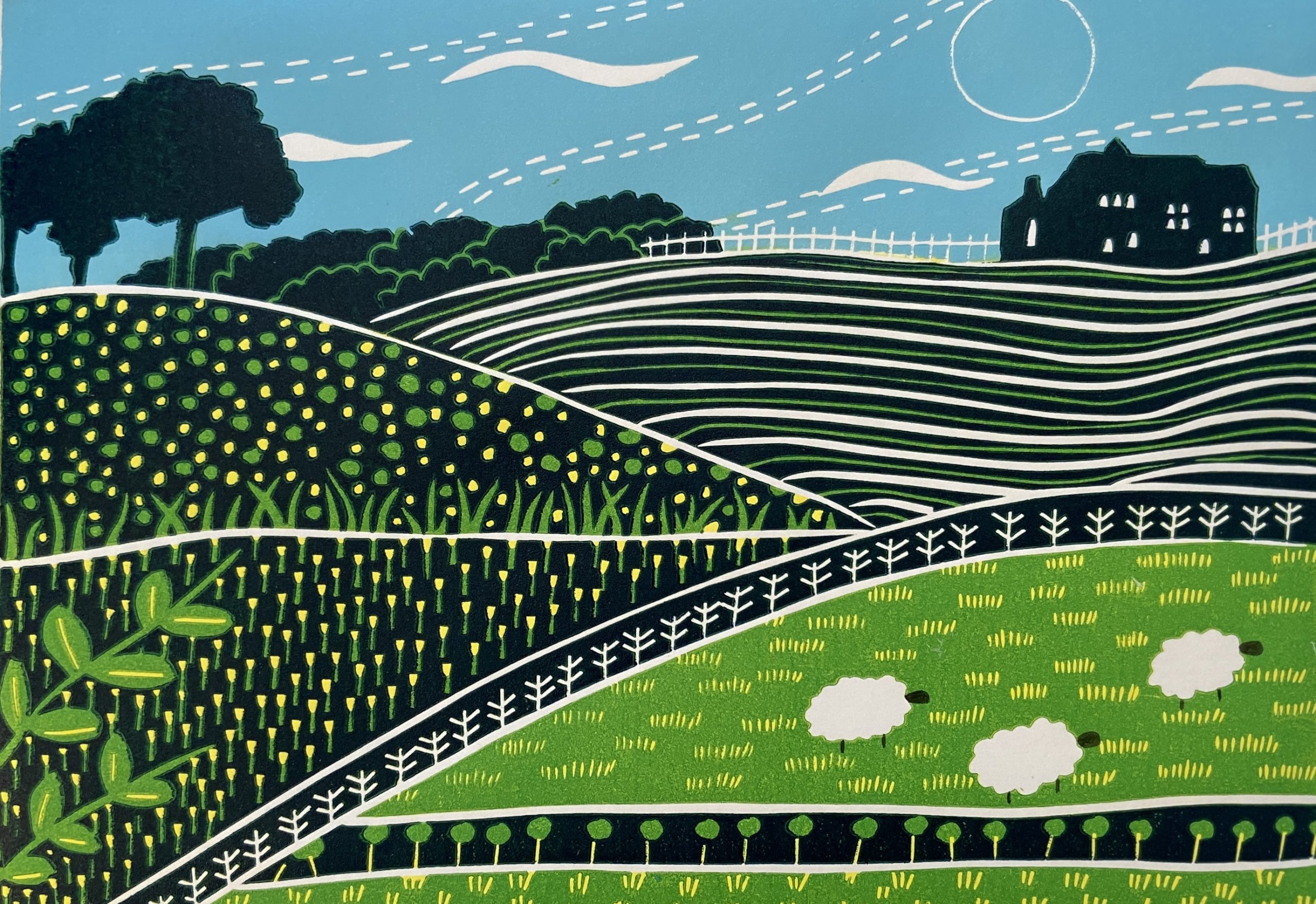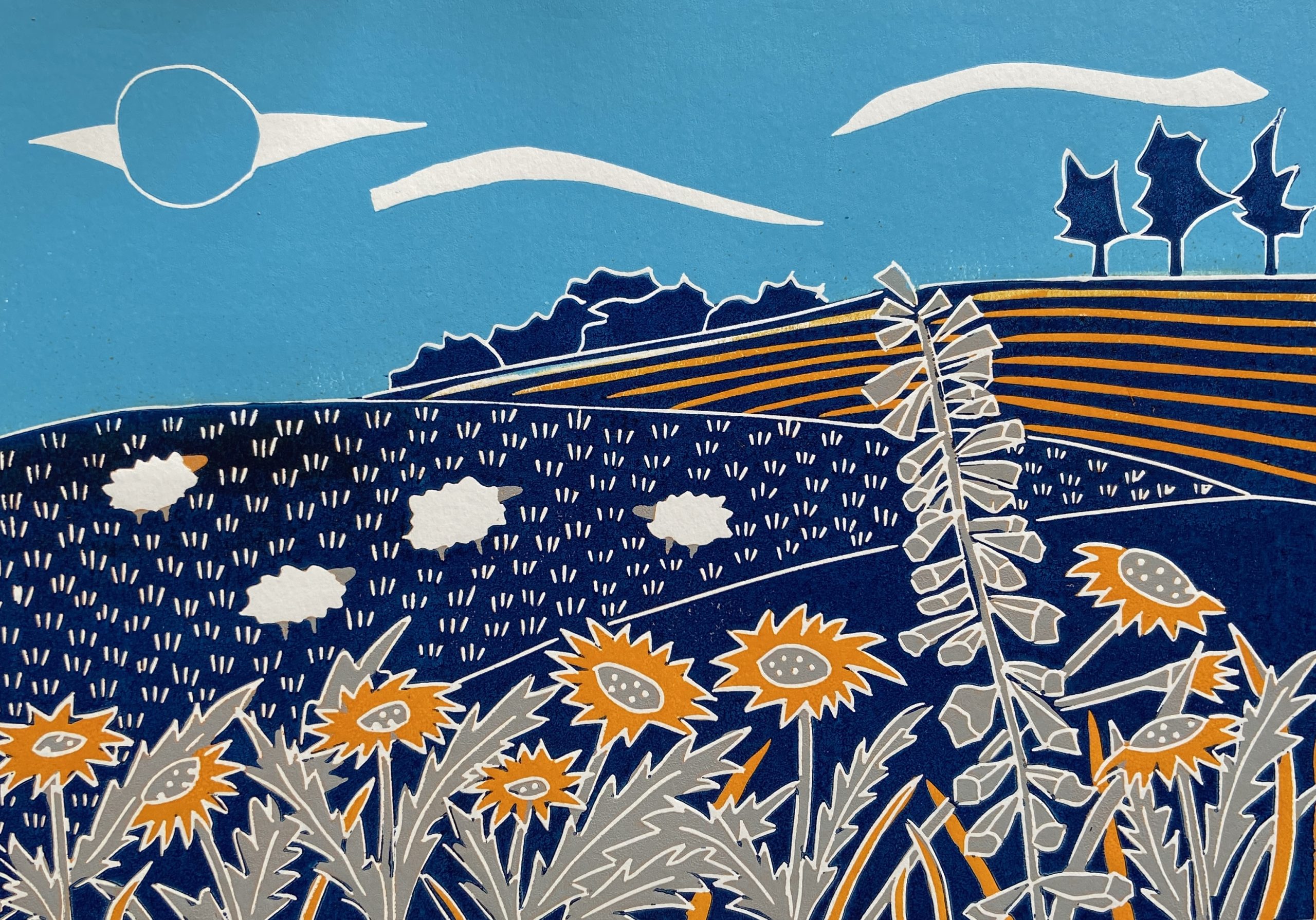 Sue’s greatest inspiration is the beautiful Sussex countryside where she lives. Working from Scots Pine Studios, in the village of Hassocks, she creates linocut prints and paintings using a combination of photography and sketching as well as drawing on her personal experiences and memories. Sue has a Fine Art Degree from the University of Brighton and mostly uses the reduction method of printmaking.