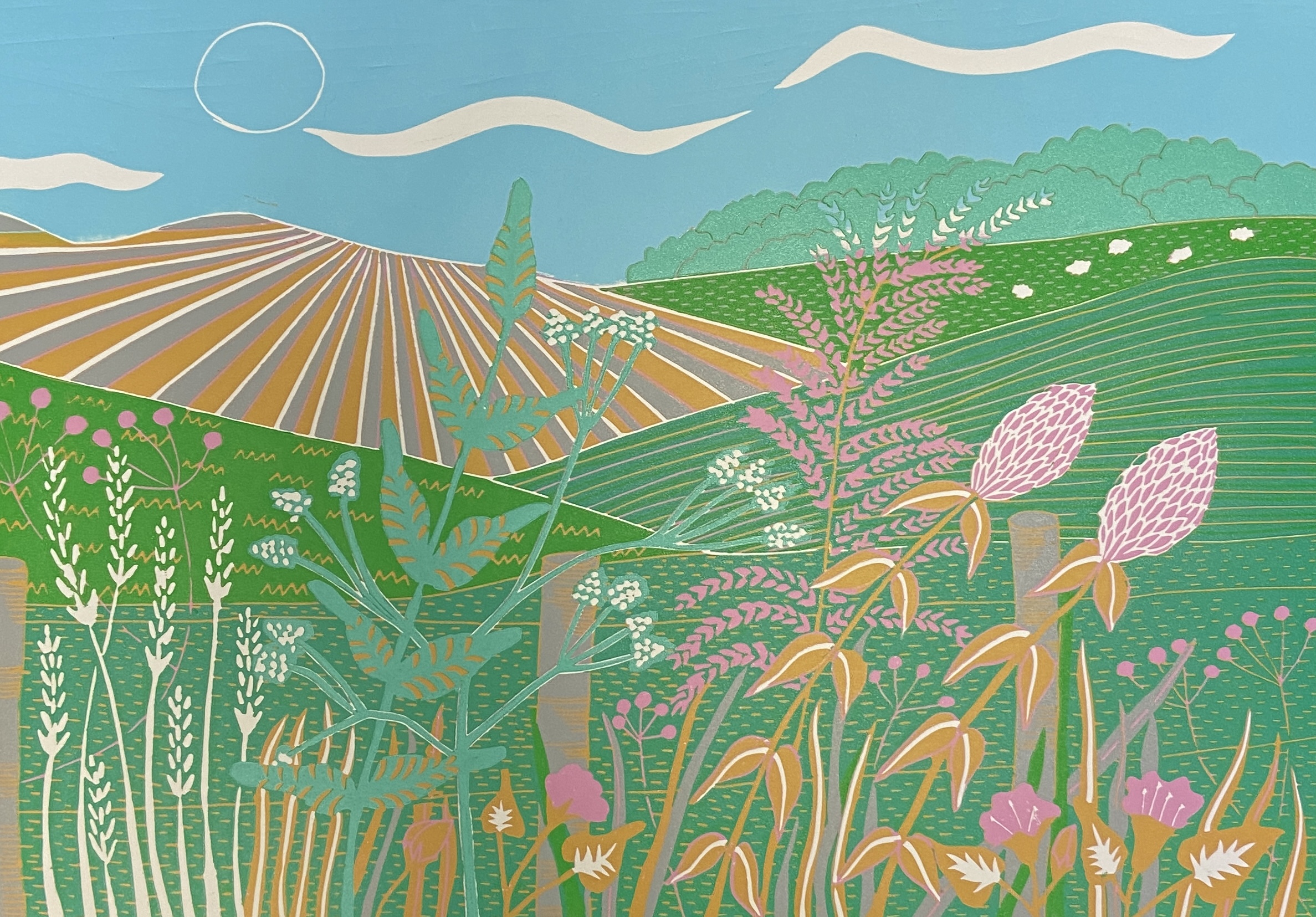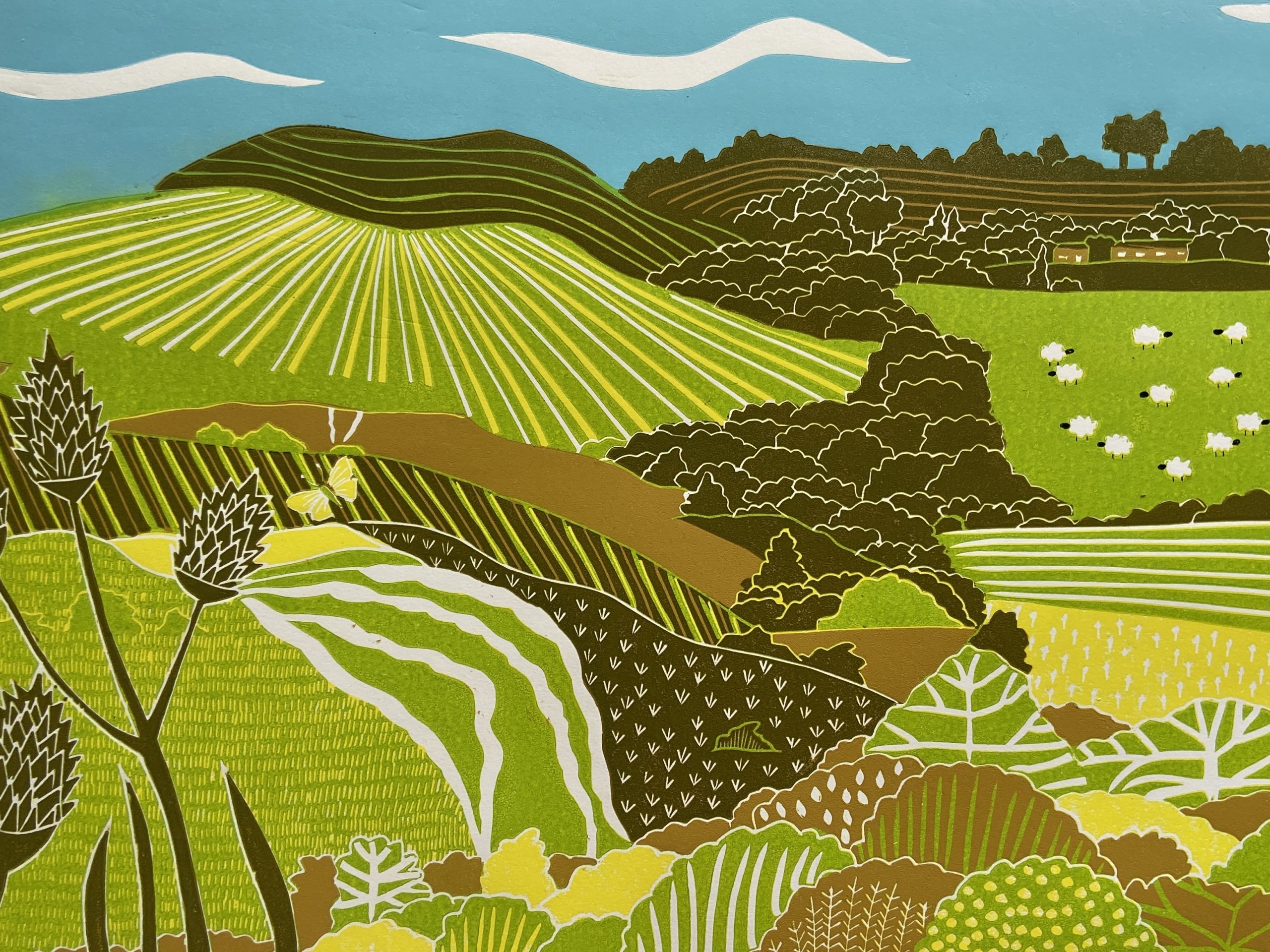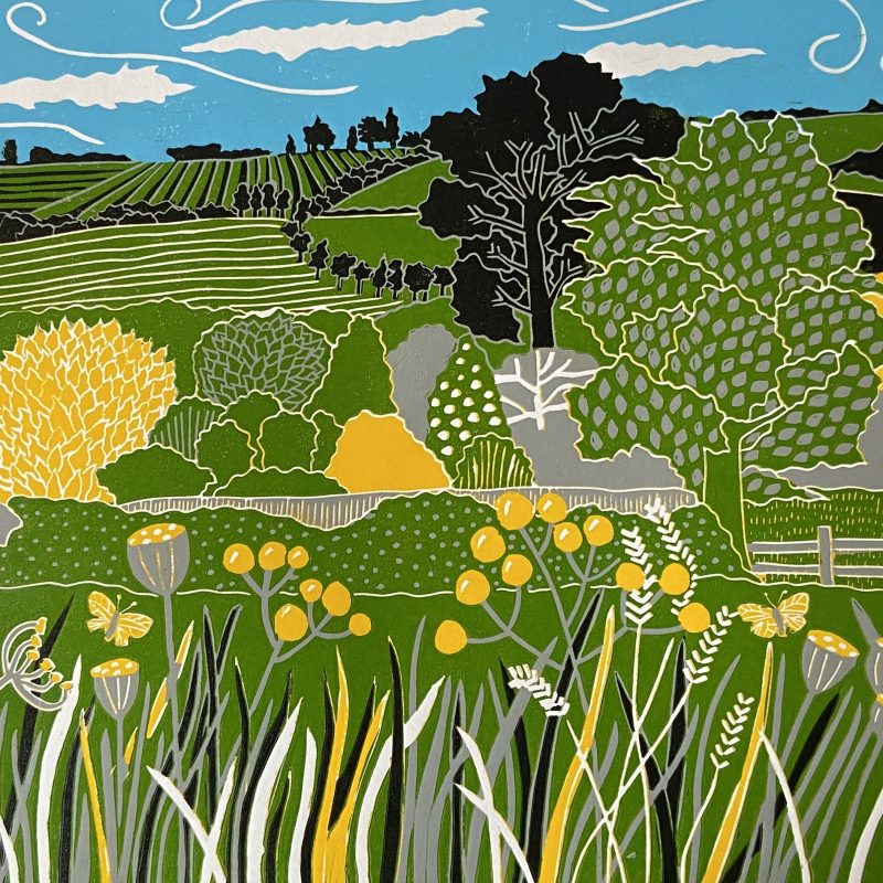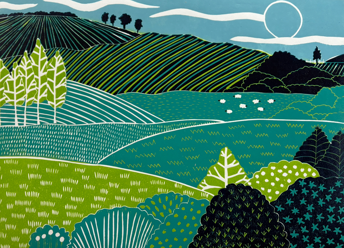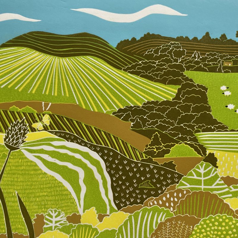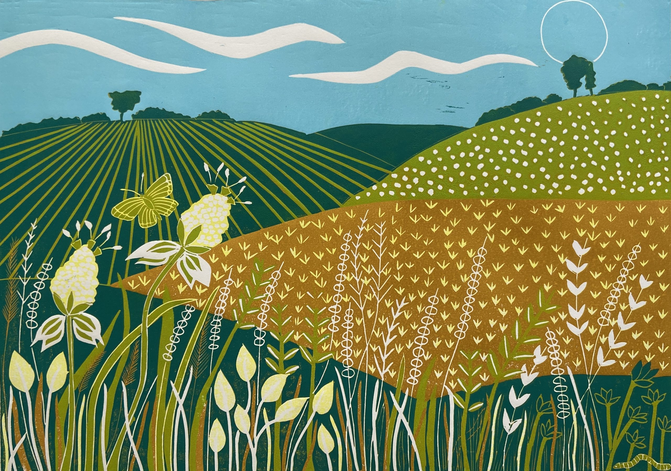 Sue’s greatest inspiration is the beautiful Sussex countryside where she lives. Working from Scots Pine Studios, in the village of Hassocks, she creates linocut prints and paintings using a combination of photography and sketching as well as drawing on her personal experiences and memories. Sue has a Fine Art Degree from the University of Brighton and mostly uses the reduction method of printmaking.