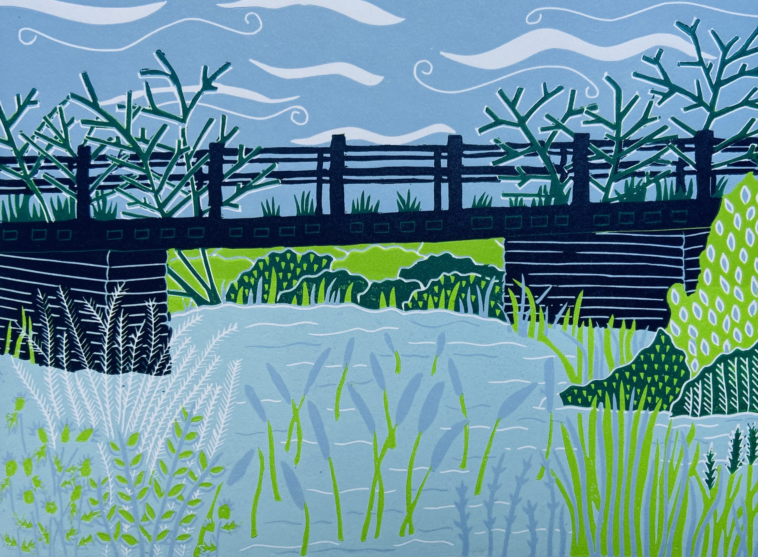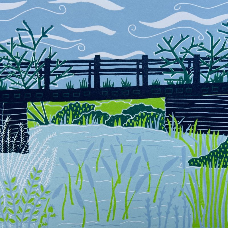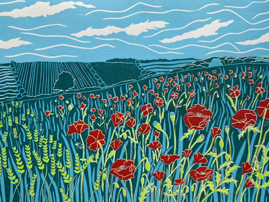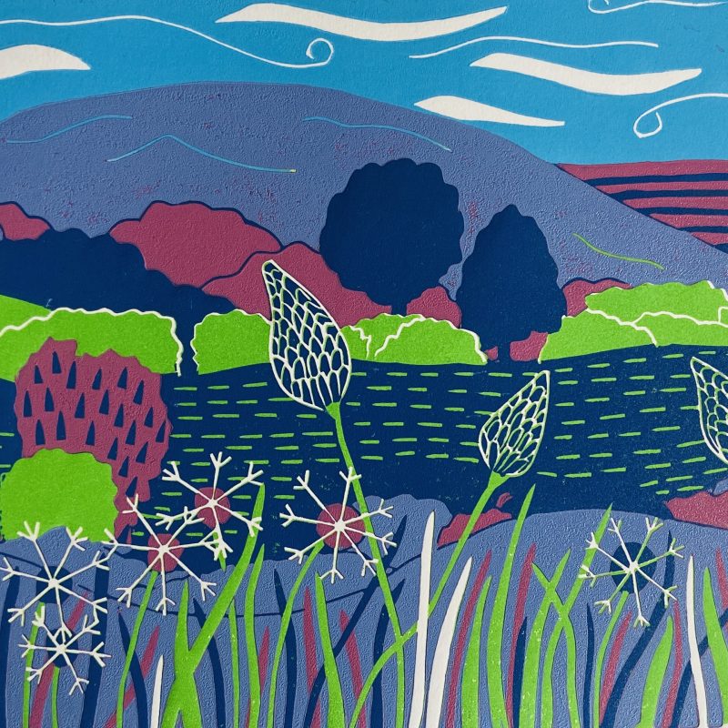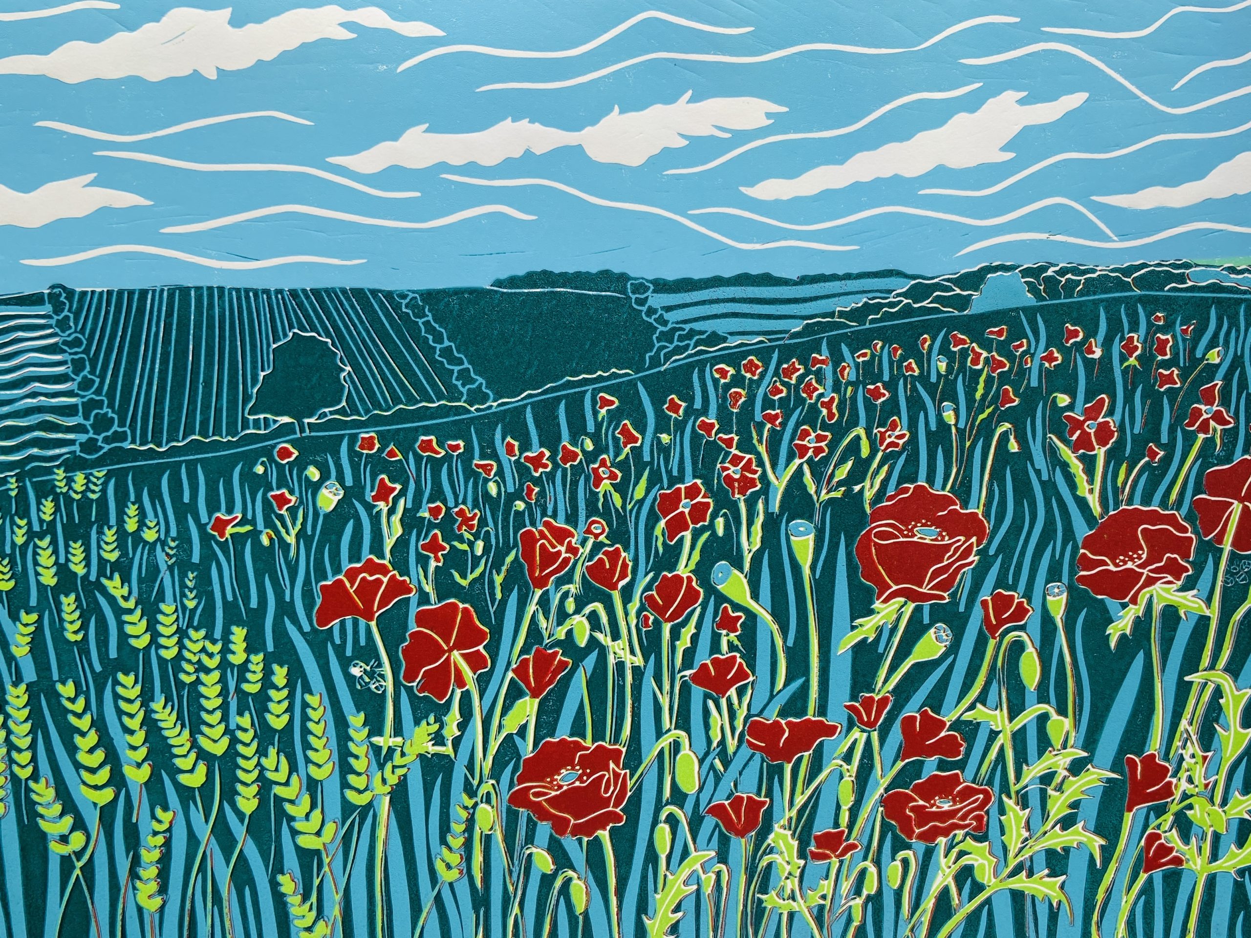 Sue’s greatest inspiration is the beautiful Sussex countryside where she lives. Working from Scots Pine Studios, in the village of Hassocks, she creates linocut prints and paintings using a combination of photography and sketching as well as drawing on her personal experiences and memories. Sue has a Fine Art Degree from the University of Brighton and mostly uses the reduction method of printmaking.