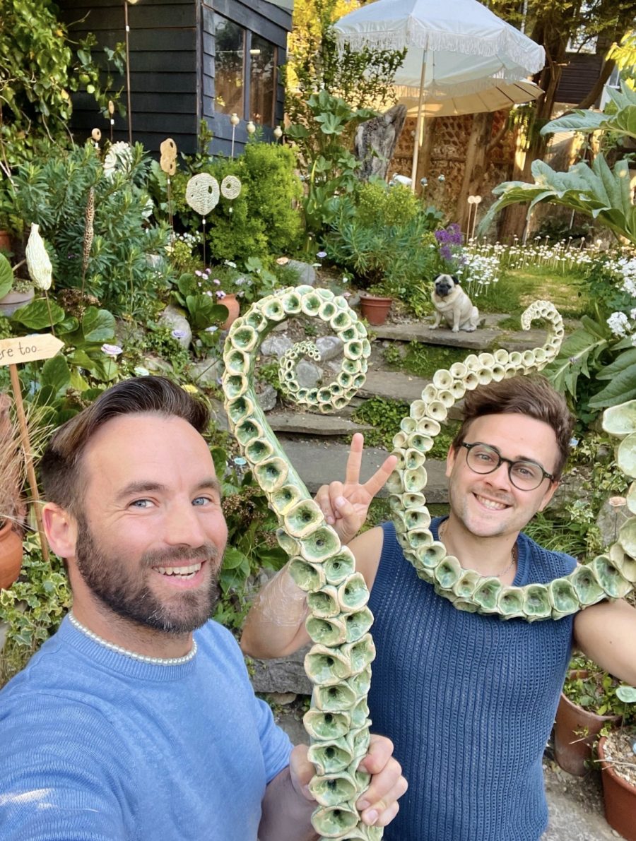 Adam & Dan in their ceramic filled garden