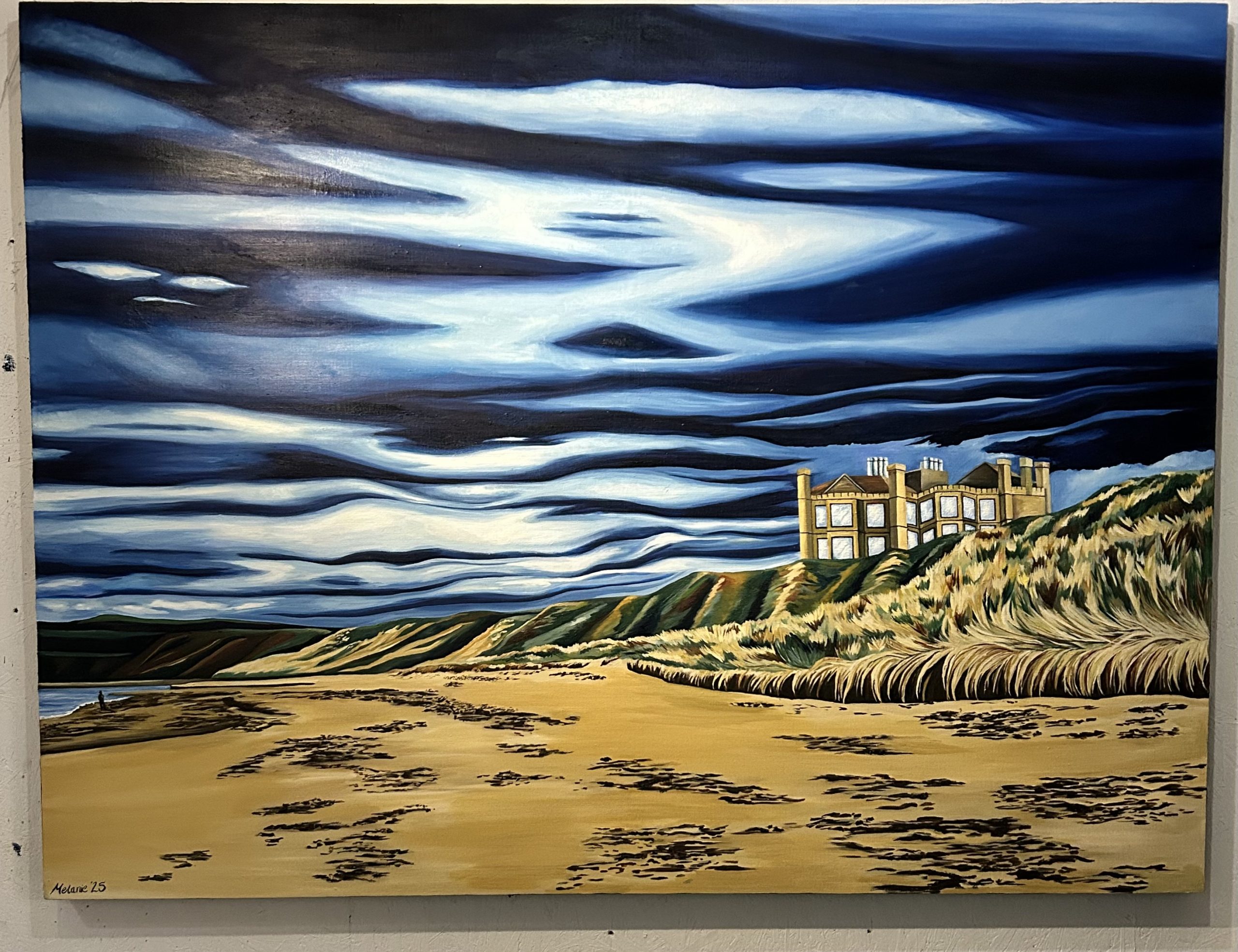 Large scale colourful painting of a vast beach scene