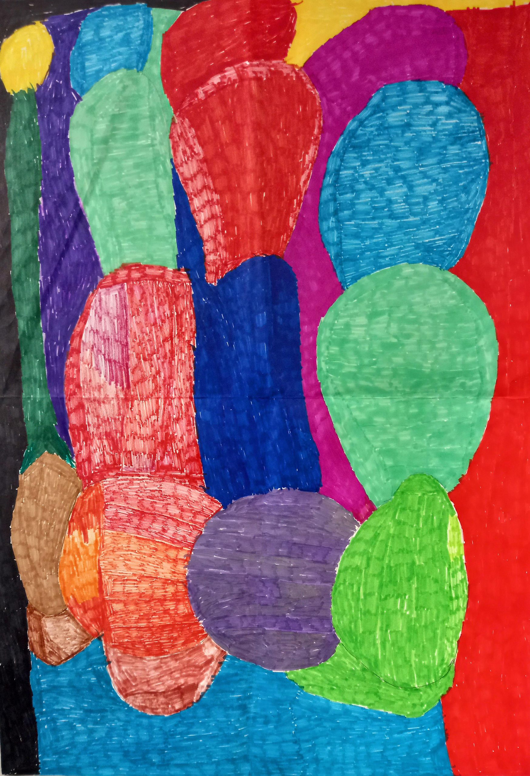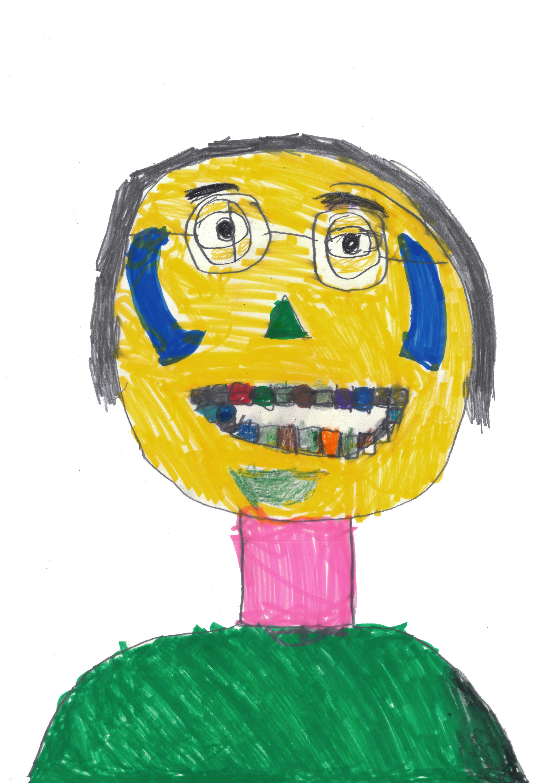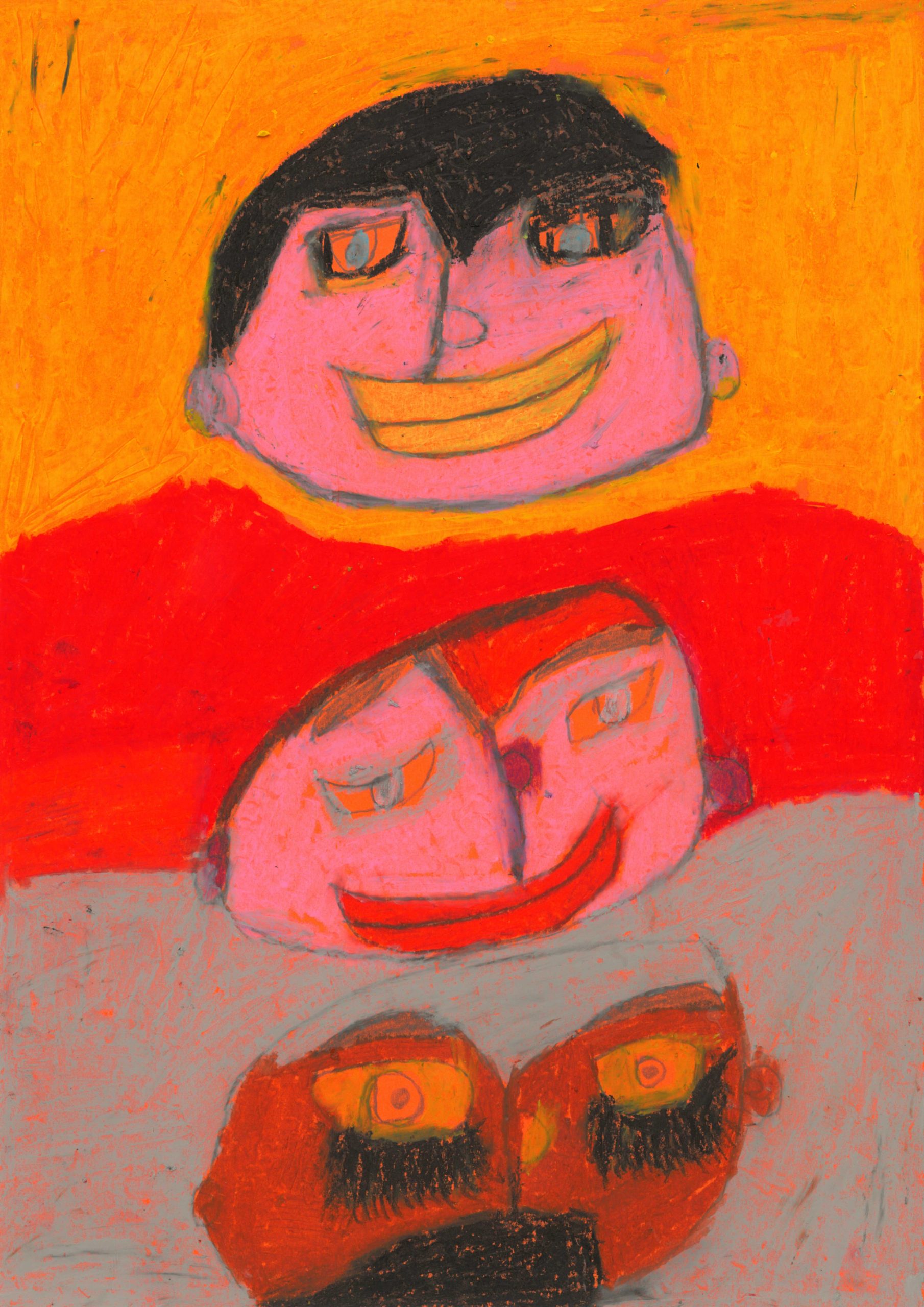 A3 size drawing in oil pastel on paper. A large round red face with purple boarder on yellow background with small body of arms and legs in dark leaf green. The body of the person is standing on a strip of orange ground. Round black eyes on the face with royal blue frames. The face has straight black line for a mouth. The whole drawing has a boarder of dark blue.