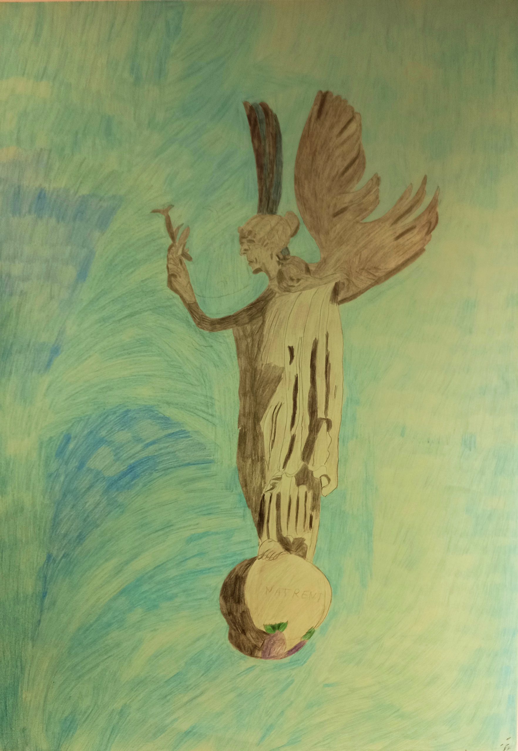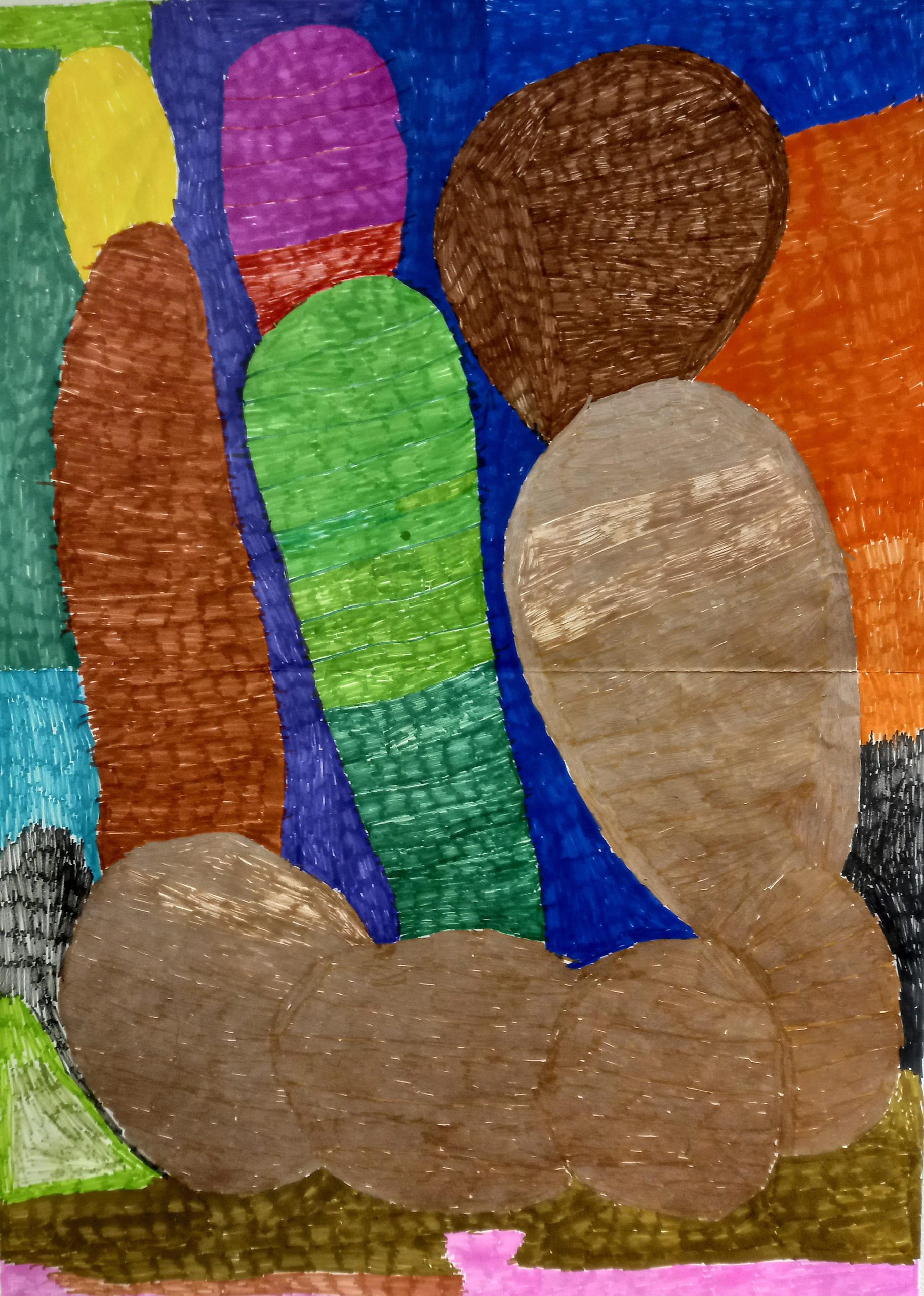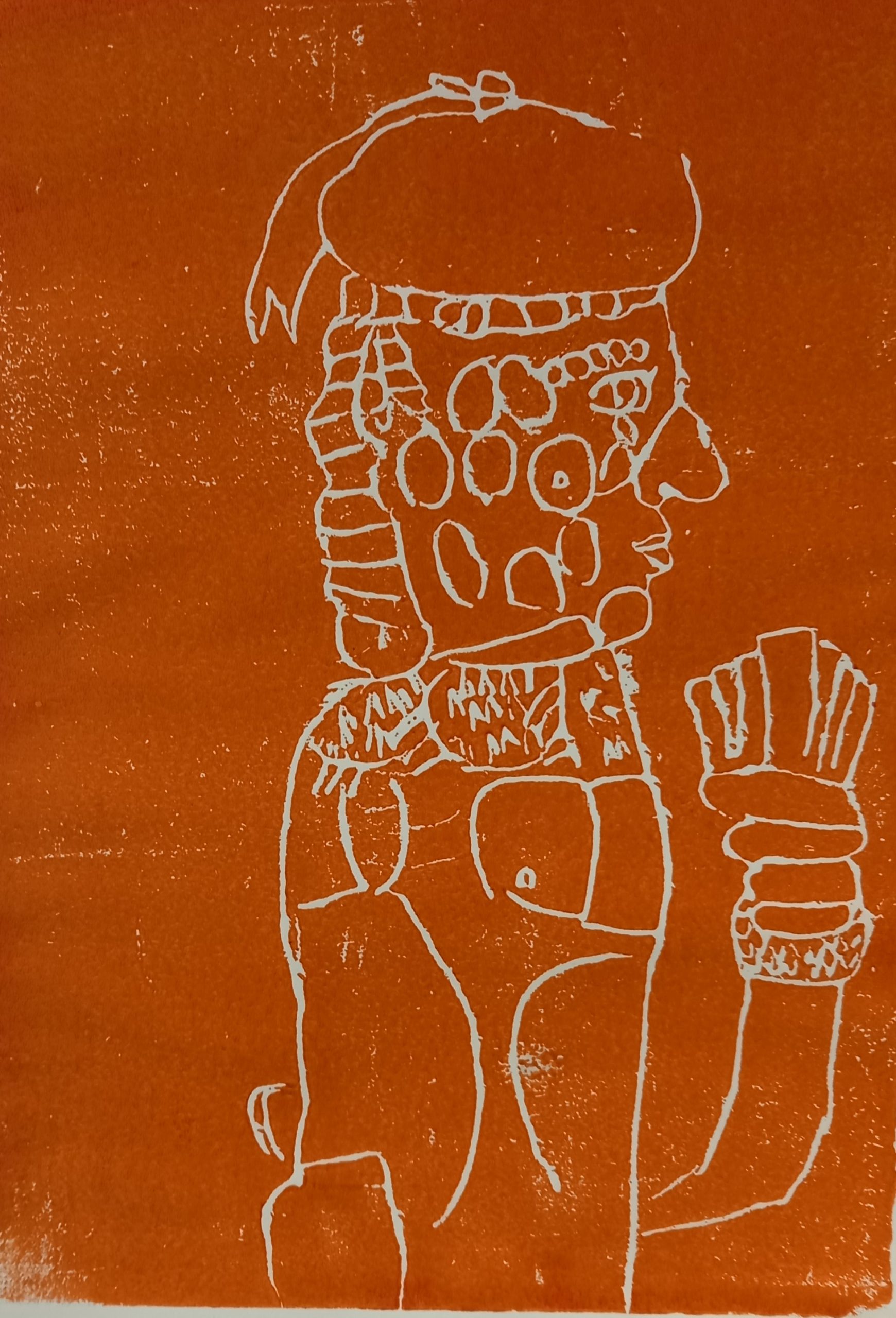 A3 size drawing in oil pastel on paper. A large round red face with purple boarder on yellow background with small body of arms and legs in dark leaf green. The body of the person is standing on a strip of orange ground. Round black eyes on the face with royal blue frames. The face has straight black line for a mouth. The whole drawing has a boarder of dark blue.
