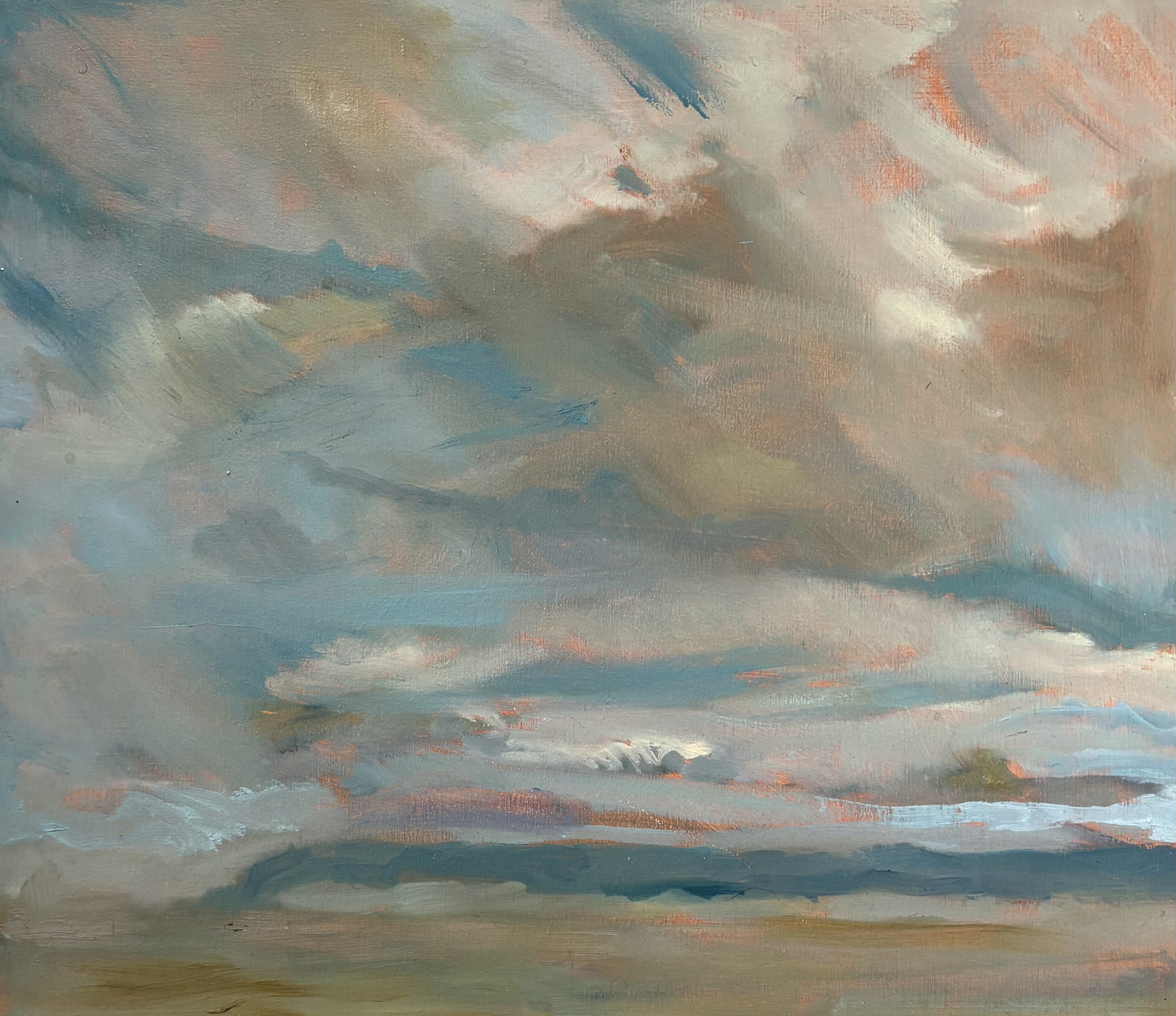 Introducing a selection of sky paintings and landscapes exploring the change of light and colour from day to night, with the intention to capture the fleeting moments of a turning sky. Working en plein air from source on location and exploring the less obvious elements and the freedom that daily change brings.