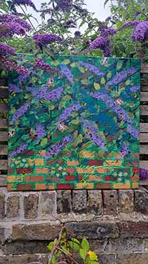 Landscape with blue sky, verdant green hills and spring flowers in the foreground, 90 x 80 cm, mixed media on board, £600