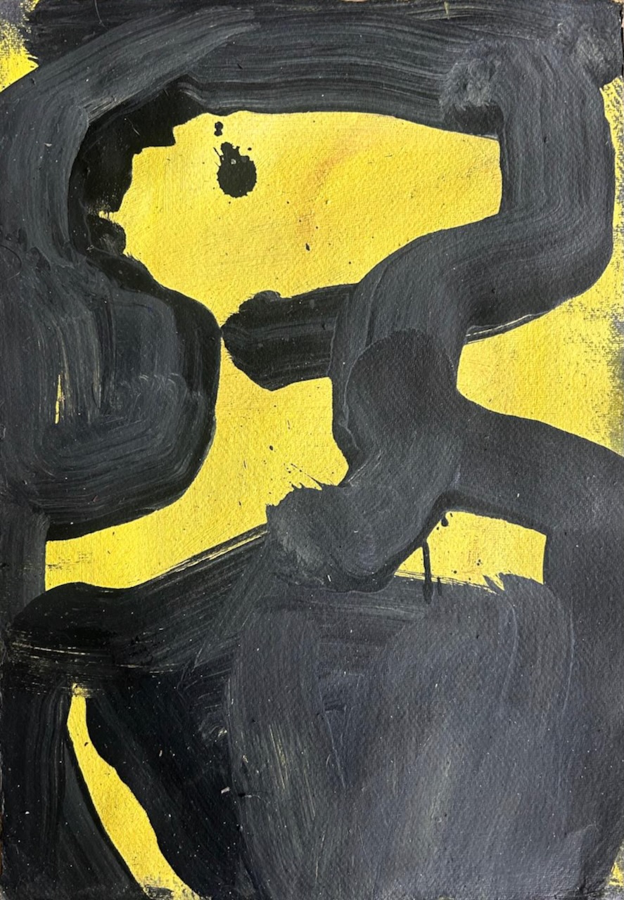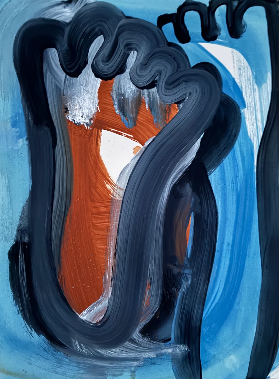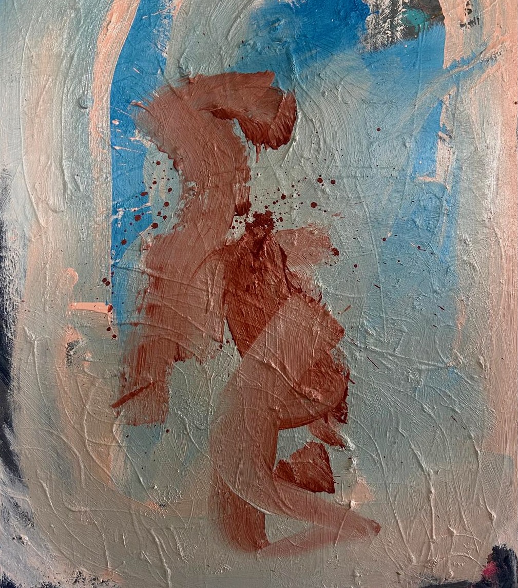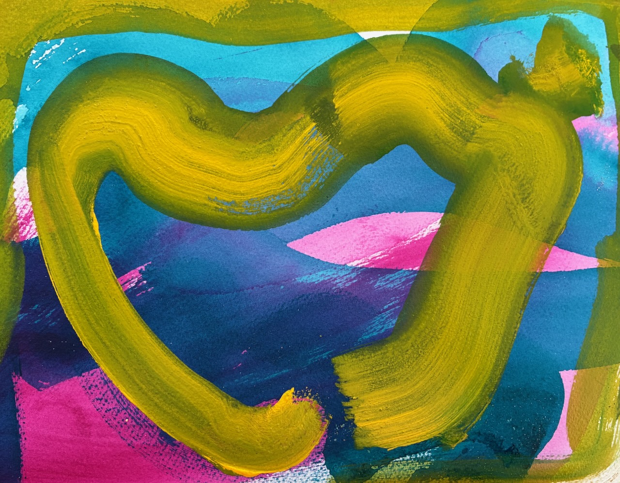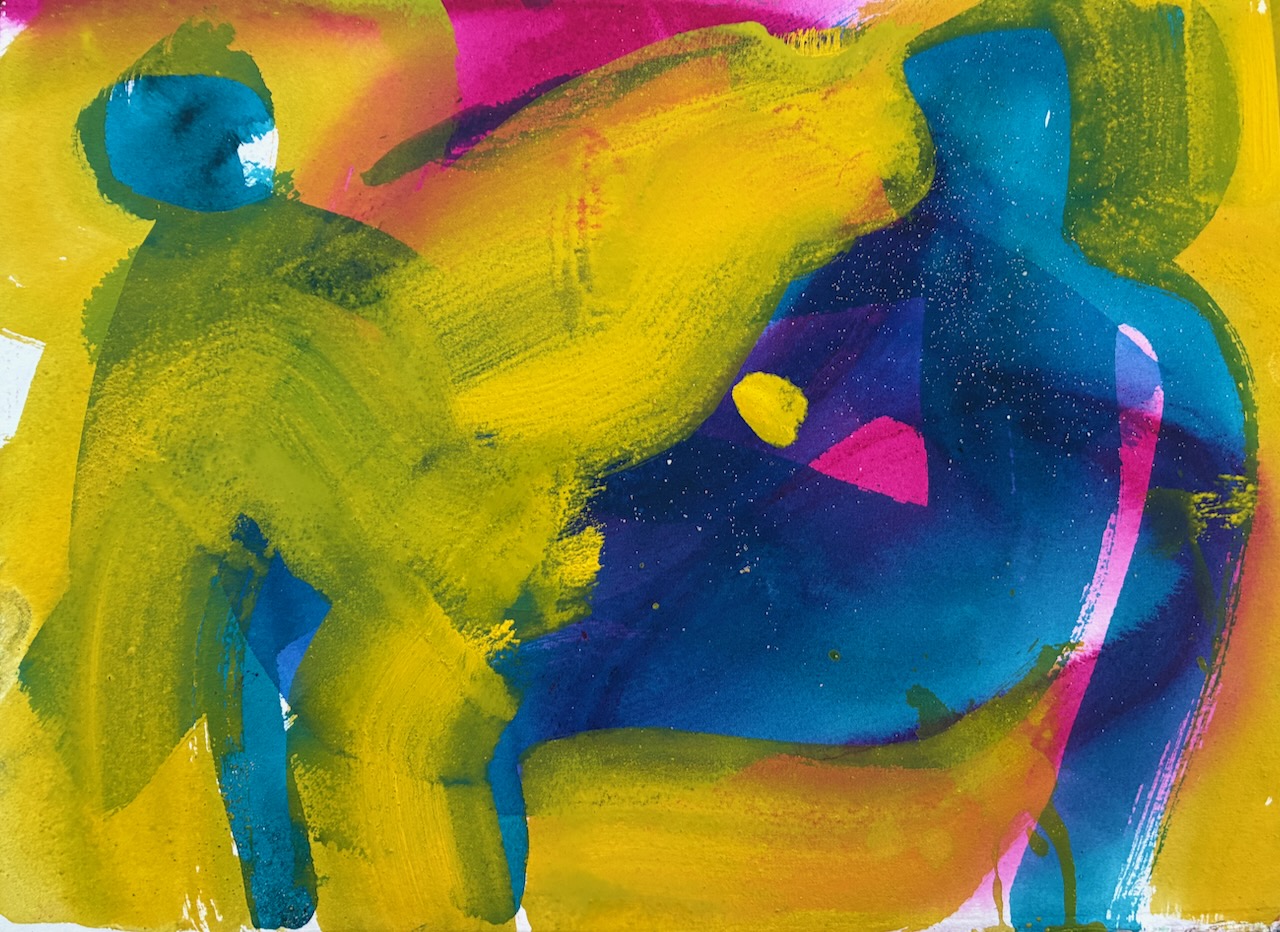 A bright blue figure clasps its hands against a yellow and magenta pink coloured ground.