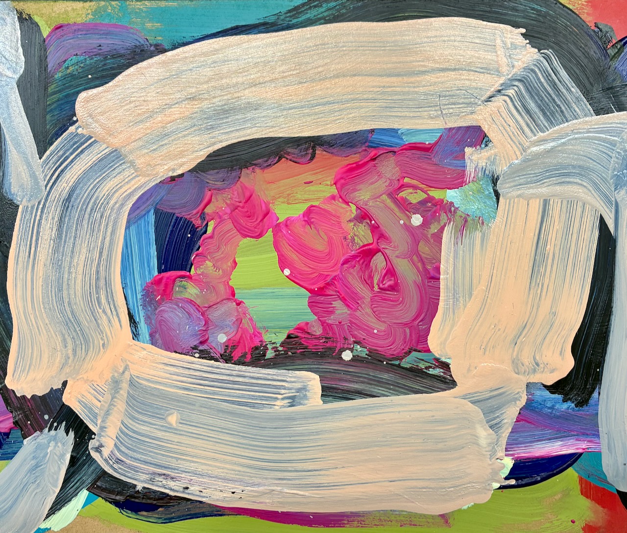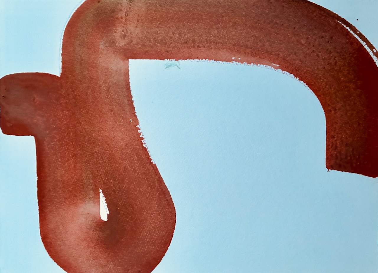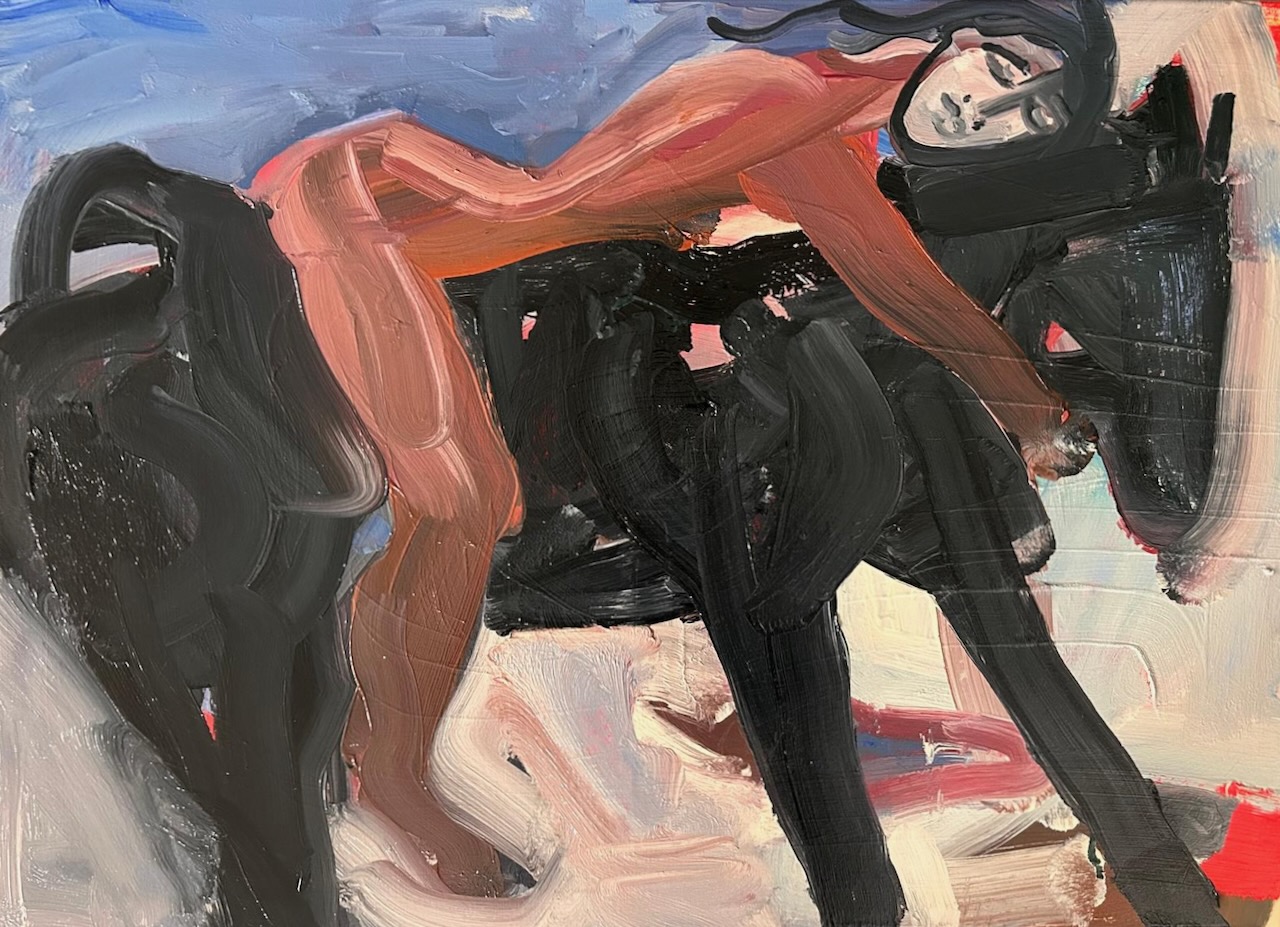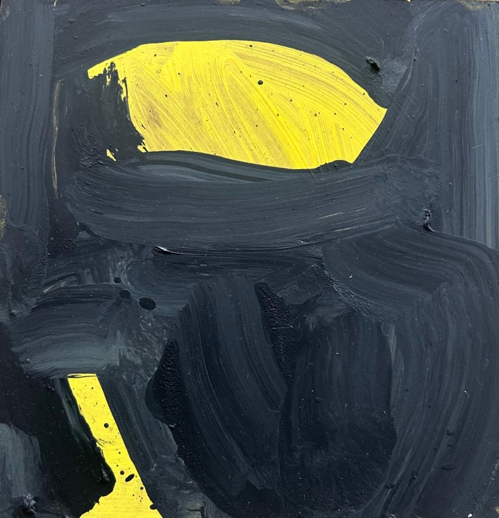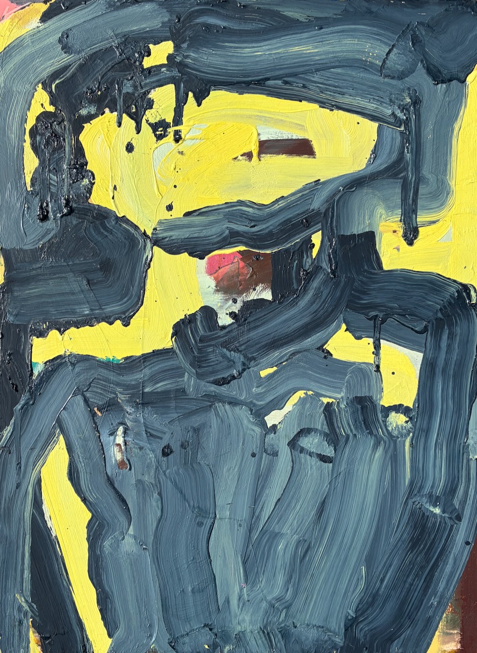 A bright blue figure clasps its hands against a yellow and magenta pink coloured ground.