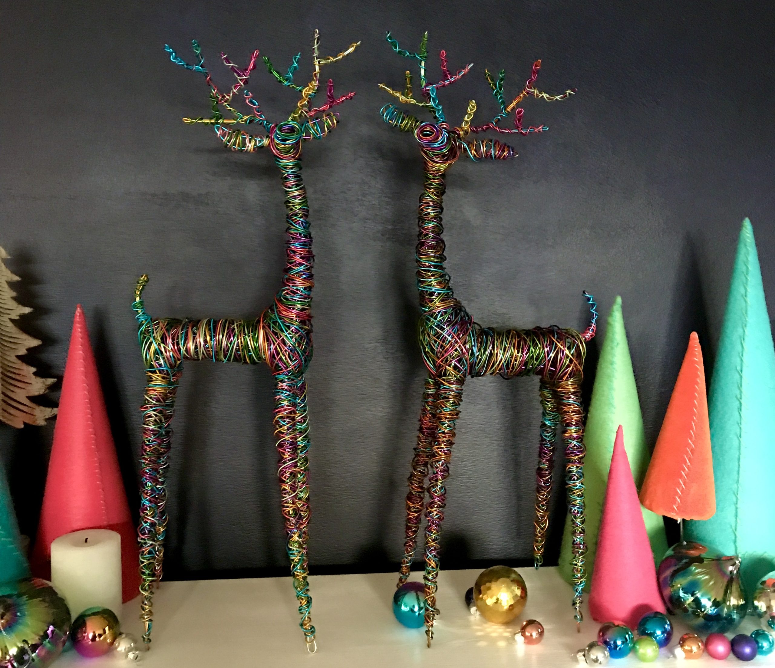 The interior of a small ceramics studio with some elegant  colourful wire reindeer sculptures in the foreground on the worktable and some flat bauble and other shaped ceramic tree decorations some with the words, 'peace', 'love' and 'hope' on them, hanging from their antlers and on the table in front of them.