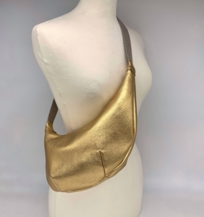 Woman wearing black and gold bomber jacket with metallic leather bag
